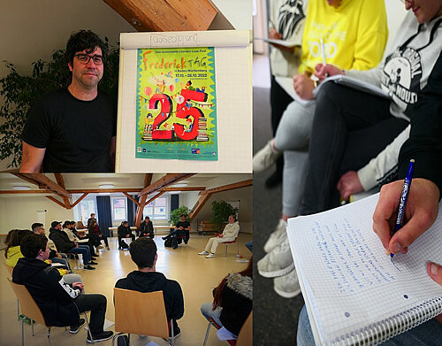 Am 26. Oktober besuchte der Germanist und Autor Tilman Rau die MGS. Im Rahmen des baden-württembergweiten Literaturfests „Frederick Tag“ – in Kooperation mit dem Kultusministerium und dem Dt. Bibliotheksverband – erlebten Schülerinnen und Schüler der SBFS und der SBS das (handschriftliche!) Schreiben als Form der Eigenermächtigung und der Kreativität abseits zielorientierten Produzierens.
