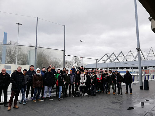 Vor dem Ulmer Eislaufstadium: Die VAB-Schüler der Max-Gutknecht-Schule in Begleitung ihrer Lehrer, Wolfgang Wurster, Winfried Stahl, Waltraud Stützle und Feras Rüdiger.