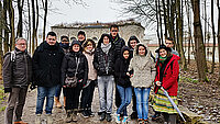 Foto: Die französischen Austauschschüler aus Briey in Ulm vor dem Fort Oberer Kuhberg zusammen mit dem Schulleiter Denis Sourdot (1. v.l., EREA Briey), der Sprachbegleiterin Carine Mbianda (3. v. l), der Lehrerin Sonia Leblanc (4. v.l., EREA Briey), MGS-Lehrer Uli Kuhn und Juliette Constantin (Gedenkzentrum Oberer Kuhberg, vorne rechts)