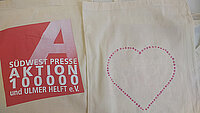 Doch leider gehen die Weihnachtseinkäufe - sowohl in Ulm als auch in der ganzen Welt - immer noch häufig mit einem zu hohen Verbrauch an Plastiktüten einher. Um dem entgegen zu steuern, gibt es dieses Jahr, von der AKTION 100.000, auf dem Ulmer Weihnachtsmarkt, helle Jutetaschen. Auf der einen Seite der ökologisch-korrekten Taschen, ist bereits das Logo der „AKTION 1000 und ULMER HELFT e.V“, aufgedruckt, auf der anderen Seite wurde aber bewusst noch Platz gelassen. Platz, der auf Wunsch der Südwest-Presse, gern von engagierten Helfern gestaltet werden kann.