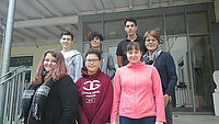 Foto: VAB-Klassenlehrerin, Waltraud Stützle, mit sechs von acht Schülerinnen und Schülern des Vorqualifizierungsjahres Arbeit/Beruf, des Berufsfeld „Soziales“ an der Max-Gutknecht-Schule.