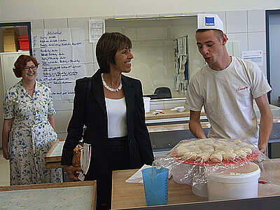 Foto 3: Besuch in der Backstube: RAZ-Leiterin B. Simon mit Frau Dr. Stolz