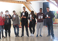 Foto: Stolz präsentieren die Schülerinnen und Schüler der Klasse VAB 3 der Max-Gutknecht-Schule das Lösungswort einer Gruppenübung in der Aula am Standort Ulm in der Schillerstraße 15